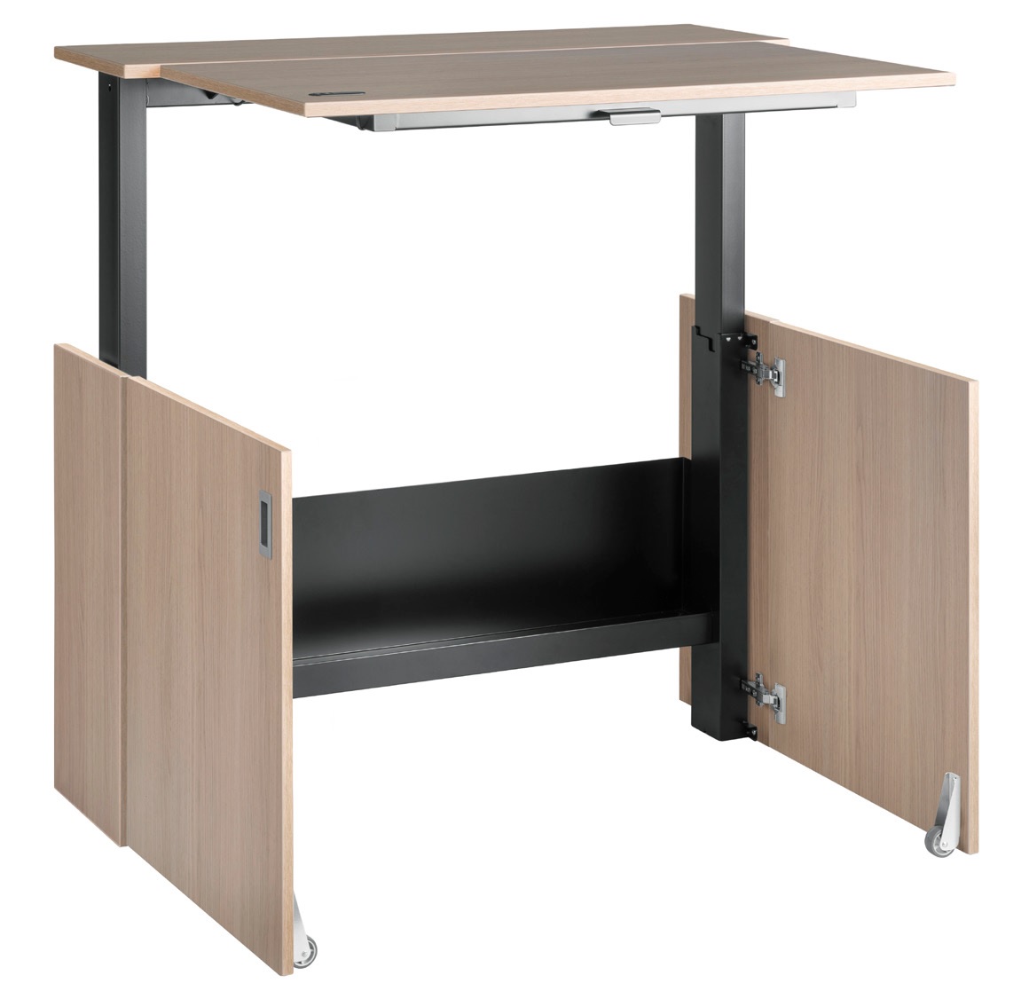 Die Verwandlung vom einfachen Schränkchen zum vollwertigen Arbeitsplatz geht schnell und einfach durch Öffnen der Türen und Hochklappen der Arbeitsplatte. In der Arbeitsplatte befindet sich die Bedienung der Höhenverstellung.