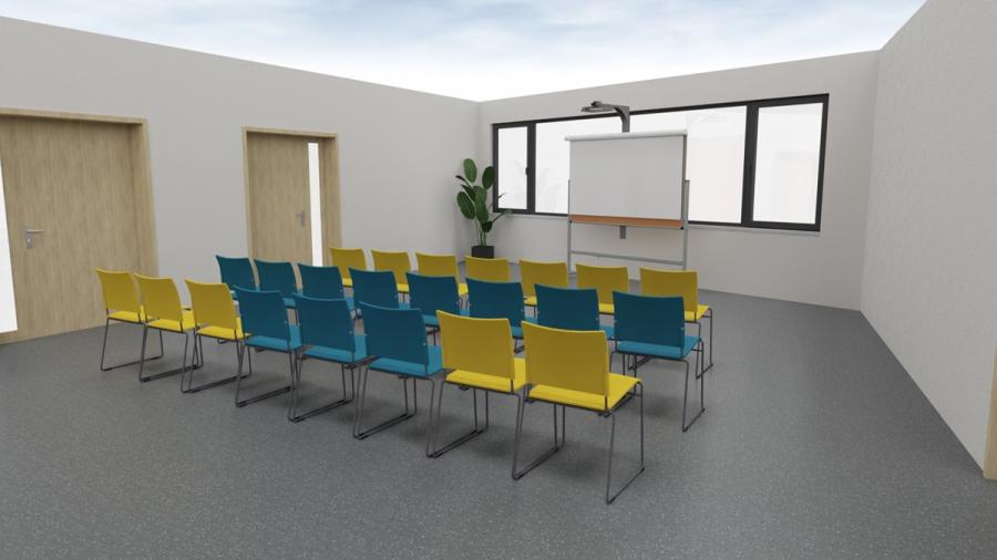 23 Stk. Elegante, ergonomische Konferenzstühle mit Vollkunststoff Sitz-/Rückenlehne (11x blau, 12x gelb)