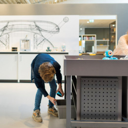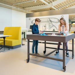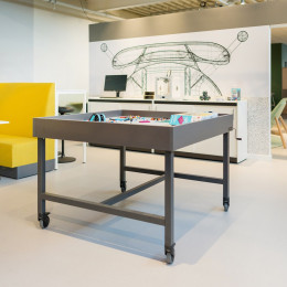 Spark ist ein multifunktionaler Tisch, der eigens entwickelt wurde, um im Unterricht digitale Kompetenzen mithilfe von Robotik zu vermitteln. Der Rand der Tischplatte ist mit der (herausnehmbaren) Handkurbel höhenverstellbar. Im höchsten Stand (90 cm) kann der Tisch auch als normaler Gruppentisch ohne Umrandung verwendet werden.
