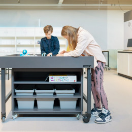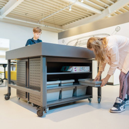 Der Unterschrank für den Spark Tech-Tisch wurde eigens für die übersichtliche Aufbewahrung von (Unterrichts-)Materialien und Werkzeugen für die Robotik entwickelt. Unter jeden Spark Tisch passen 2 Unterschränke auf Rollen. Der Schrank kann dank der Einlegeböden mit unterschiedlichen Schubladenserien ausgestattet werden, unter anderem Level, Gratnell und/oder Lego-Schubladen. Der hochstehende Rand kann als zusätzliche Übungsfläche für einen Roboter dienen. Ein freistehender Unterschrank kann optional mit einer praktischen Werkzeugwand ausgestattet und so auch als mobiler Werkzeugschrank im Technikraum eingesetzt werden.