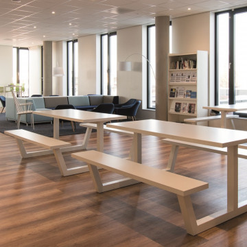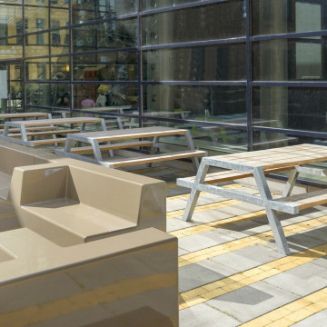 Ideal für Aufenthalts- und Arbeitsbereiche, beliebt bei Jung und Alt. Bis zu 8 Personen finden Platz an dieser klassischen und extrem stabilen Sitzformation - alles aus einem Guss. Rahmen wahlweise aus verzinktem oder pulverbeschichtetem Stahl.