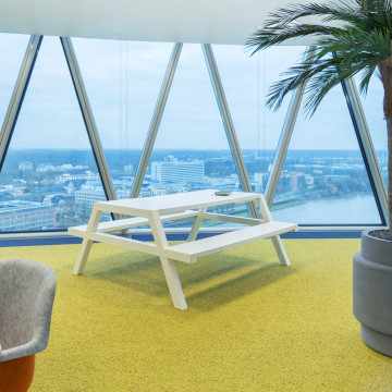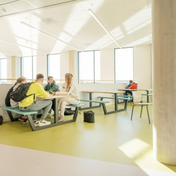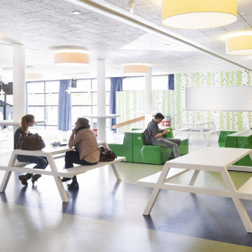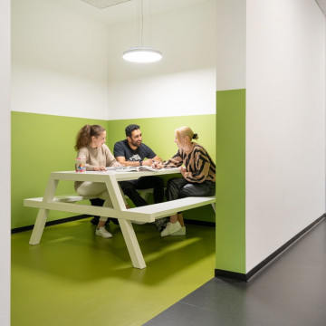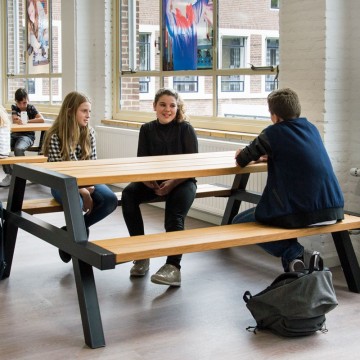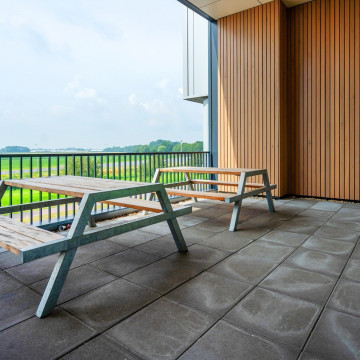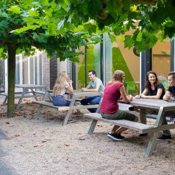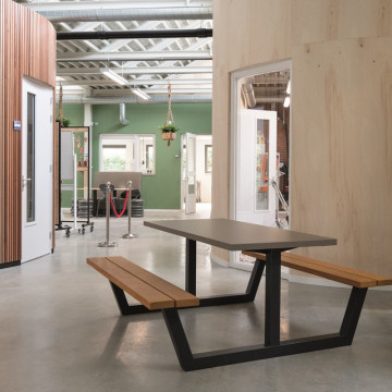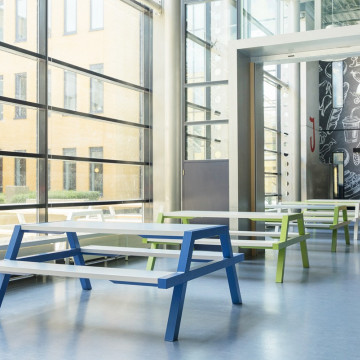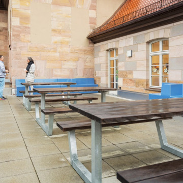 Tischplatte und Sitzfläche aus outdoortauglichem, unbehandeltem Bilinga-Hartholz aus nachhaltiger Bewirtschaftung oder „schwer entflammbaren“ 40 mm Albasia- Tischplatten mit robuster HPL-Beschichtung.