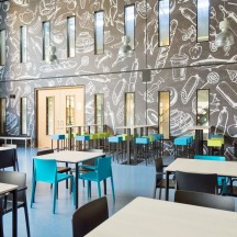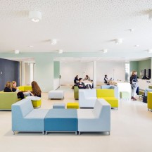 Die Aula ist Versammlungsraum und Marktplatz. Hier ist die Fantasie von Bauherr und Architekt besonders gefordert. Besucher sollten ein offenes, freundliches und zeitgemäßes Umfeld vorfinden. Eine durchdachte Farbphilosophie sorgt für Ordnung, Individualität und Atmosphäre. Innen- und Außenbereiche bilden eine harmonische Einheit.