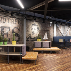 Helle, großzügige Räume mit Nischen bieten interessante Möglichkeiten für die Gestaltung von gemütlichen Lounge-Ecken, Rückzugsbereichen und Aufenthaltszonen. Bequeme Sitzmöbel bieten Entspannung und laden zu Aufenthalt und unkonventionellem Arbeiten ein.