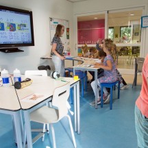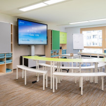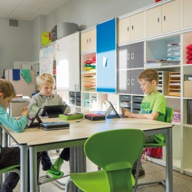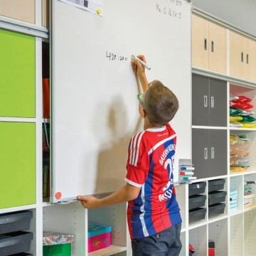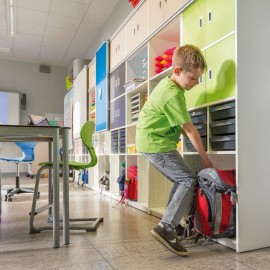 Der modulare All-in-One Klassenzimmerschrank als Basiselement für Aufbewahrung und Präsentation sorgt für Ordnung und Freiraum. Schultaschen und persönliches Arbeitsmaterial finden hier ihren Platz – es entsteht Raum für kreatives Arbeiten. Variable Einzelarbeitsplätze und das flexible Tafelsystem passen sich unterschiedlichsten Lehr- und Lernformen an. Der Raum kann so für flexibles, individualisiertes Lernen und wechselnde Sozialformen genutzt werden.