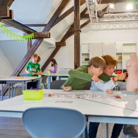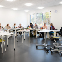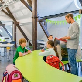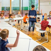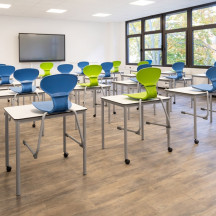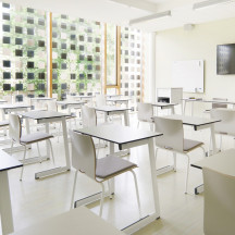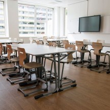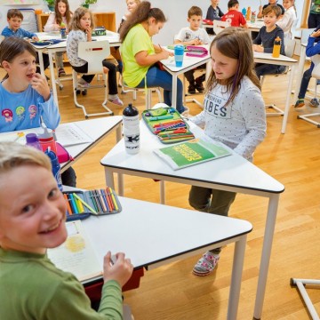 Einheitliche Tischhöhen über alle Jahrgangsstufen ermöglichen maximale Kombinationsmöglichkeiten und Stellformationen. Alle Schüler arbeiten auf gleicher Augenhöhe. Unterschiedliche Körpergrößen in der Primarstufe werden durch den Einsatz von speziellen Stühlen mit höherer Sitzposition und verstellbaren Fußrasten ausgeglichen.